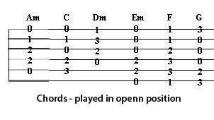 • Numbers and Frets: Numbers placed on the lines indicate which fret to press on the corresponding string. A “0” means you play the string open (without pressing any fret).