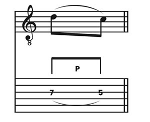 • In TAB: A curved line (slur) connects a higher note to a lower note. You may also see the letter P, either replacing or adding to the curved line.