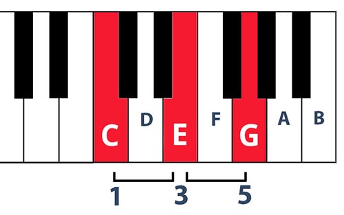 The simplest triad is a major triad consisting of notes 1, 3 and 5 from the scale. In the scale of C they would be C, G and E (as per diagram)