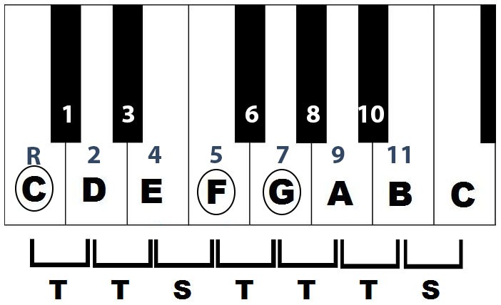 We can add a minor to the key by going the the 9th semitone being an A hence the key of C consists of C, F, G, Am