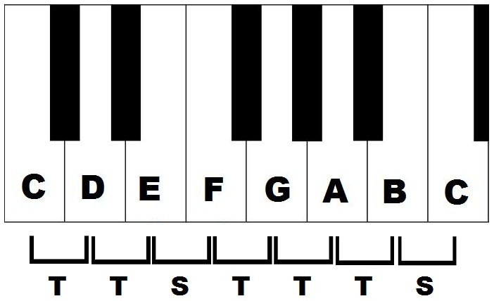 A scale is a set of notes, from our 12 notes, arranged in a set pattern. That pattern is – tone, tone, semitone, tone, tone tone, semitone or T T S T T T S.