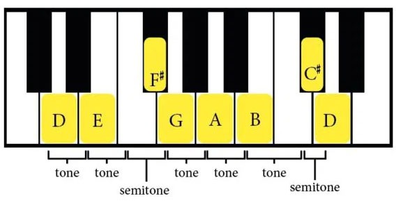 It can be best shown on the piano keyboard. If we take the C scale (ie starting on the C note), using this pattern, we end up with all major notes (no # or b). However, using the same pattern starting at D (D scale) we have an F# and C# in the scale.