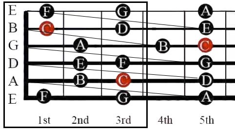 We then end up with the traditional six string fretboard as we know it. It is essential that we learn these strings and notes – to the 3rd fret