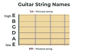 Each guitar string has a nameĀ (or note in accordance with it’s pitch/sound). The open strings (without any finger on the fret ) are named E,A,D,G,B and E – as per the diagram.